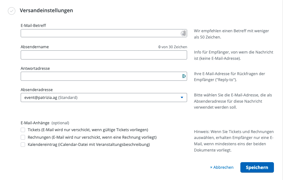 - Anhänge (Ticket, Rechnung): Testnachrichten werden grundsätzlich ohne die Dokumente im Anhang verschickt