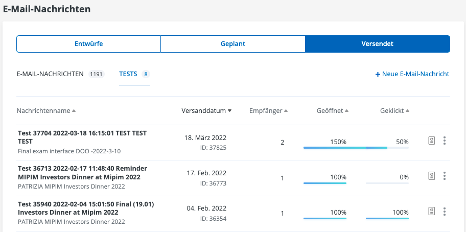 Sie können sich die Übersicht und einen Bericht über Ihre versendeten Testnachrichten anzeigen lassen, indem Sie in der Ansicht Ihrer versendeten Nachrichten den Reiter "Tests" auswählen.