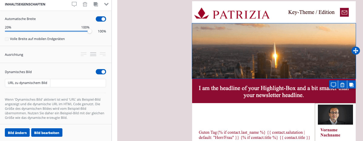 Um den HEADER der E-Mail anzupassen, wählen Sie das Bild aus und klicken Sie auf den Button „Bild ändern“ am rechten Rand in den Inhaltseigenschaften. Der Header sollte einer Größe von 5000x1250px entsprechen.