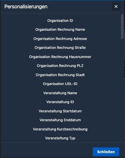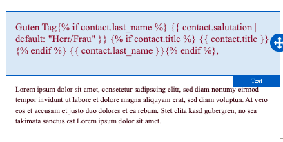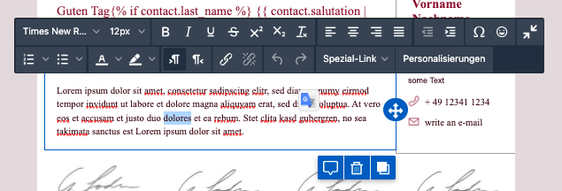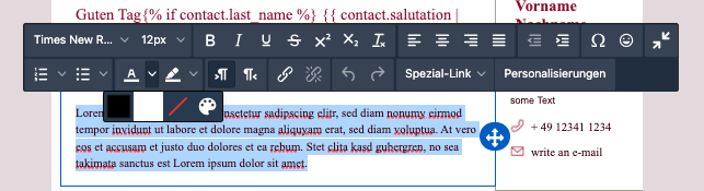 Wenn Sie in ein Textfeld klicken haben Sie die Möglichkeit Personalisierungen einzufügen.
