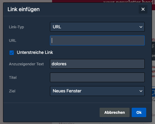 Wenn Sie eine Datei als Link einfügen möchten, markieren Sie dazu zuerst mit der Maus den gewünschten Text und klicken Sie im schwarzen Bearbeitungsmenü auf das Büroklammer-Symbol. Im neuen Fenster wählen Sie als "Link-Typ" nun "Datei verlinken" aus.