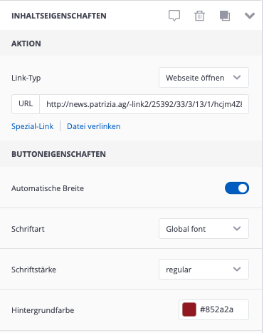 Um einen bestehenden Button in einer E-Mail Nachricht zu editieren, klicken Sie diesen an und führen Sie die gewünschten Änderungen links unter dem Punkt "Inhaltseigenschaften" durch. Hier können Sie unter anderen die Hintergrundfarbe des Buttons, die Textfarbe oder die Ausrichtung des Buttons ändern.