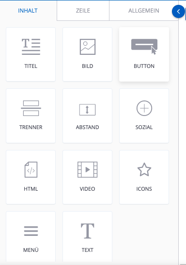 Um einen Button einzufügen klicken Sie im linken Menü auf der rechten Seite auf "Inhalt". Wählen Sie dort das Symbol "Button" an und ziehen dieses per Drag und Drop an die gewünschte Stelle in der E-Mail Nachricht.