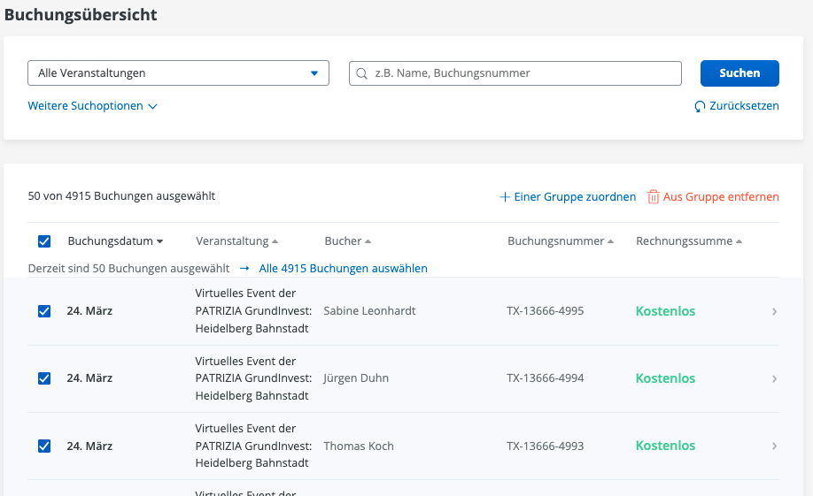 - Wählen Sie in der ersten Spalte der Tabelle, neben der Spalte „Name“, die Checkbox aus, um alle Buchungen der ersten Tabellenseite auszuwählen