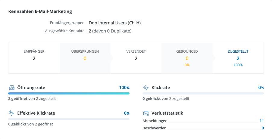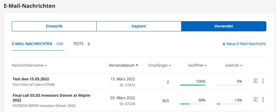 Nach dem Versand wird der Status Ihrer E-Mail automatisch auf den Status "Versendet" geändert. Wählen Sie den Reiter "Versendet" aus, hier erhalten Sie bereits erste Angaben zum Erfolgsbericht.