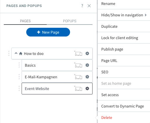 Hier können Sie alle bestehenden Unterseiten einsehen und neue erstellen. Über das Zahnradsymbol können Sie außerdem bestehende Seiten umbenennen, duplizieren oder löschen. Mithilfe des 3-Punkte-Symbols vor jedem Seitenamen, können Sie die Reihenfolge der Seiten mittels Drag & Drop ändern. Es ist auch möglich Seiten anderen Seiten unterzuordnen.