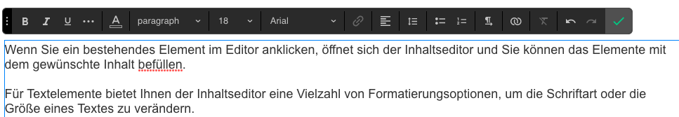 Für Textelemente bietet Ihnen der Inhaltseditor eine Vielzahl von Formatierungsoptionen, um die Schriftart oder die Größe eines Textes zu verändern.