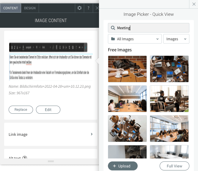 Bei Bildern können Sie entweder eigene Dateien hochladen oder auch auf lizenzfreie Bilder zugreifen, die der Editor kostenlos zur Verfügung stellt. Wir empfehlen, die Bilder in der Größe in Ihren Editor zu laden, in der sie auch auf der Website angezeigt werden sollen, um unnötig lange Ladezeiten der Seite zu vermeiden - so sollten z.B. die Bilder einer Diashow nicht breiter als 1600 Pixel sein.